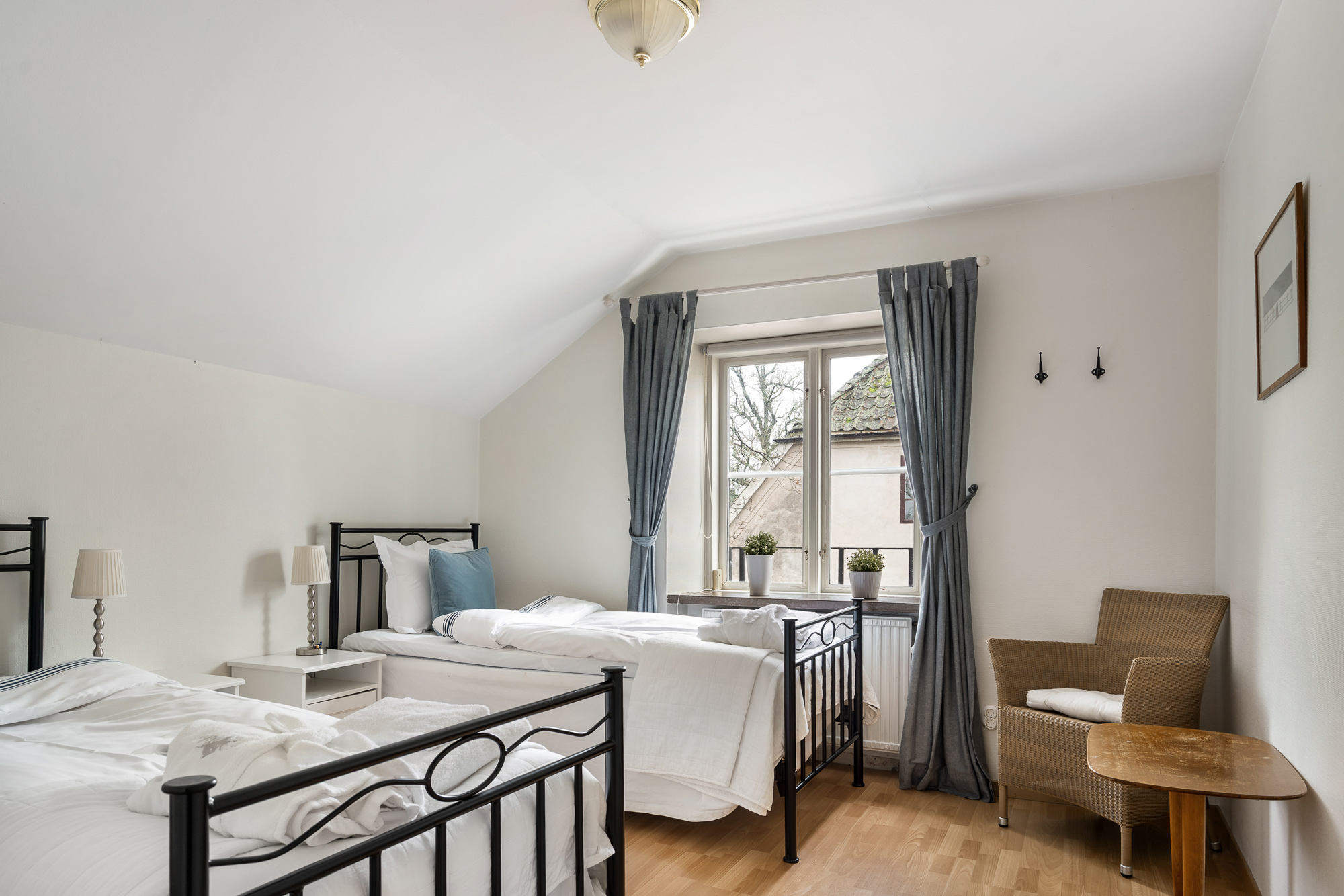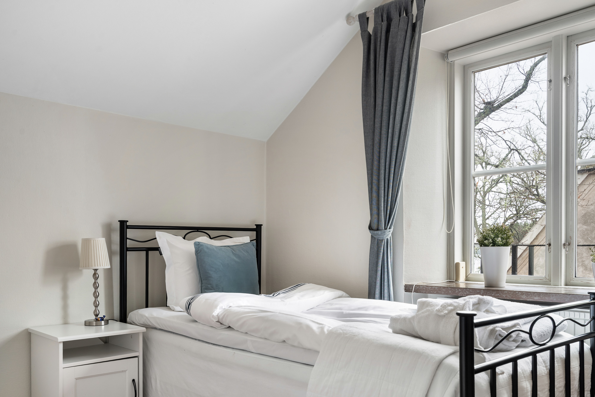 Ett dubelrum möblerat med två enkelsängar, beläget en trappa upp i Hästflygeln och med utsikt mot herrgården.