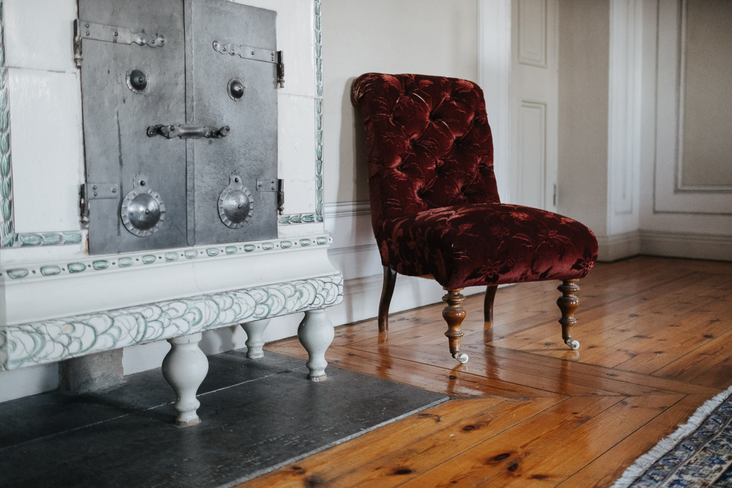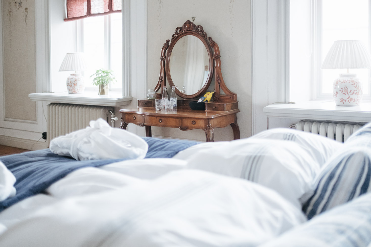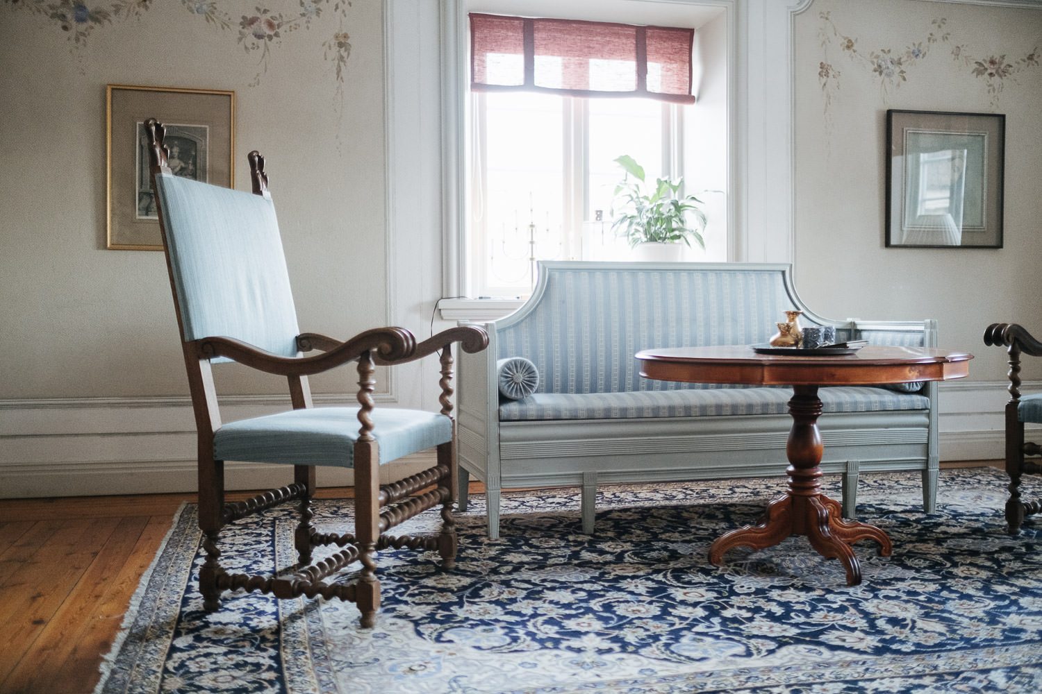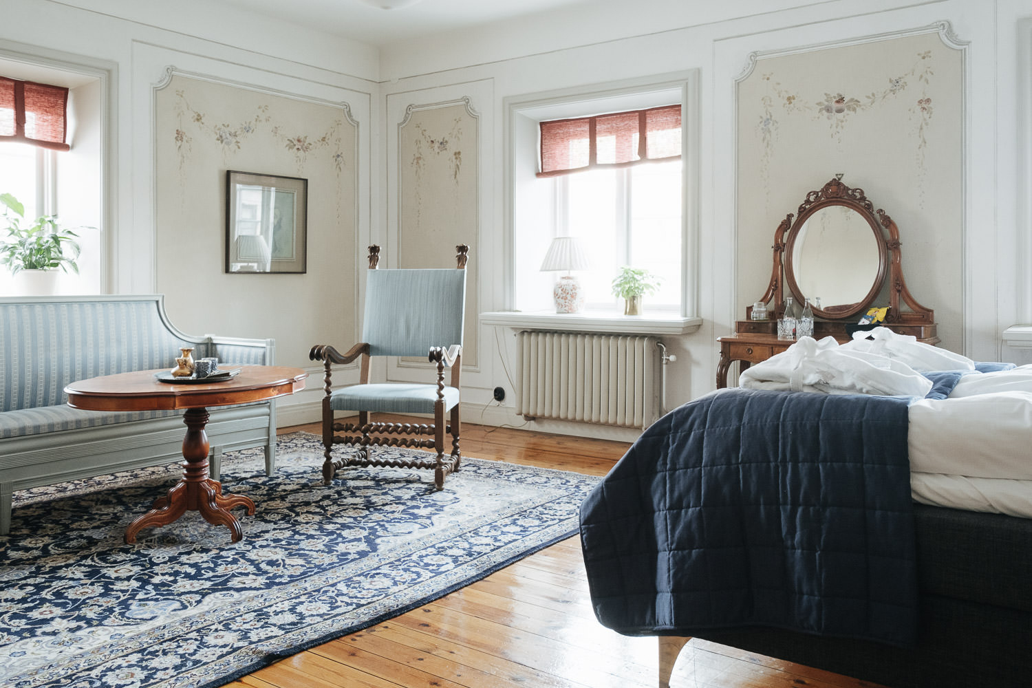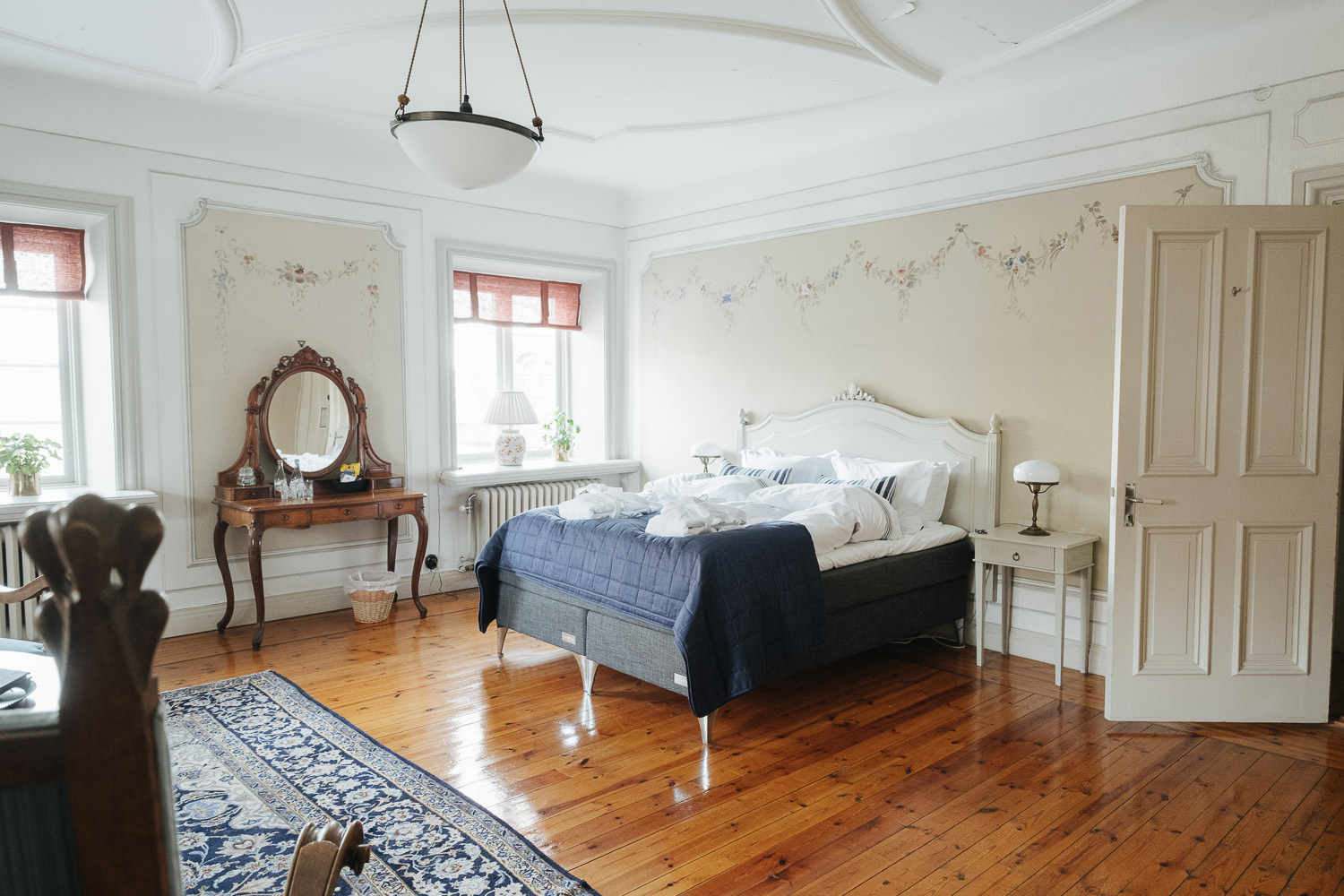 Här bodde kung Oscar II vid sina besök på herrgården. Ännu ett rum för spökena säger de som känner efter, kan det möjligen vara kung Oscar? Oroa dig inte, spökena är vänliga så låt inte det avskräcka dig från en natt i detta vackra rum! Underbara målningar på väggarna, färgerna matchade av vår härliga inredare Maria Samuelsson från FORMaria, en härlig sittgrupp och en ny dubbelsäng från Zebra Collection.