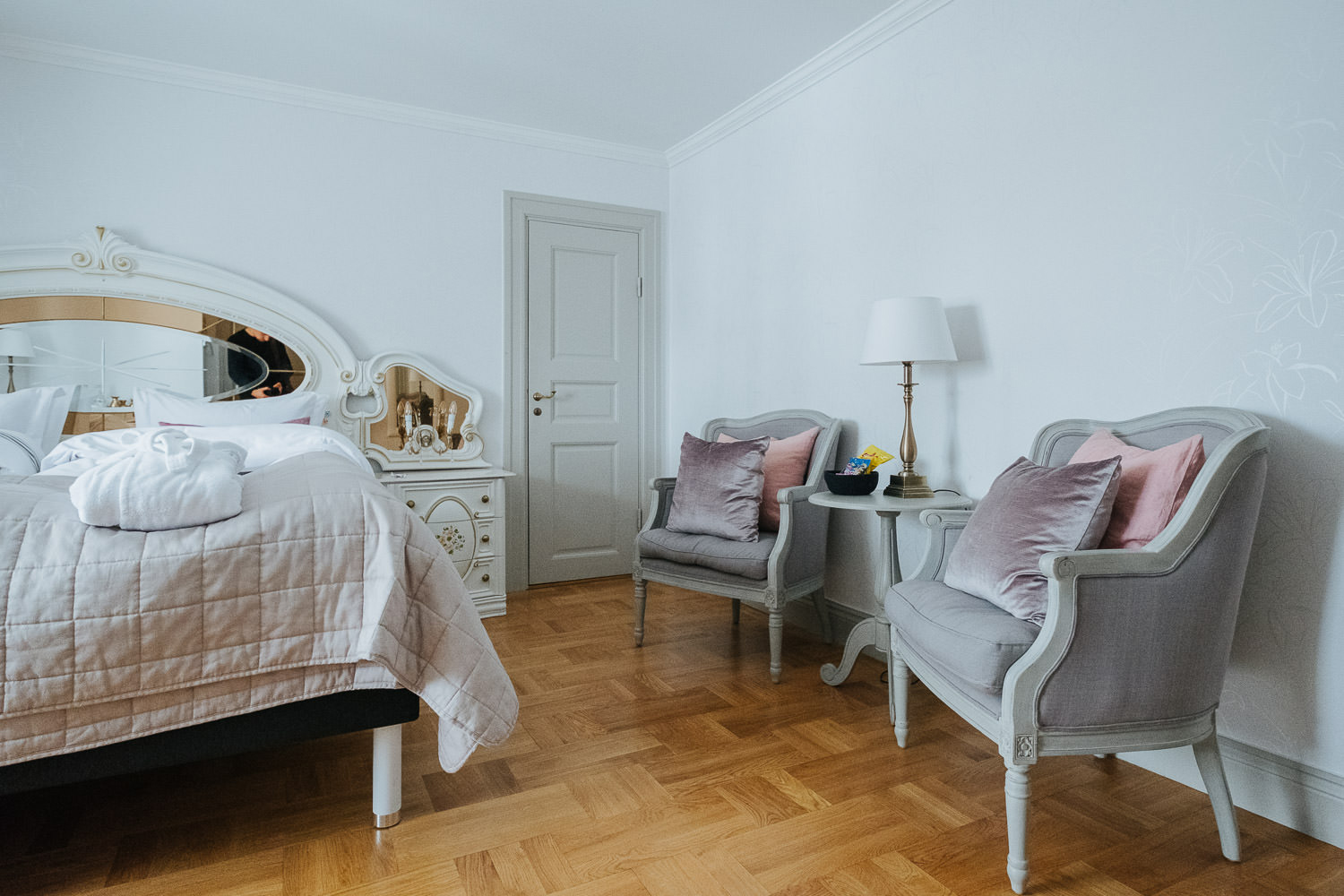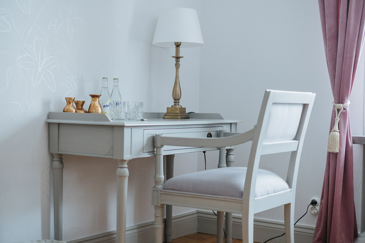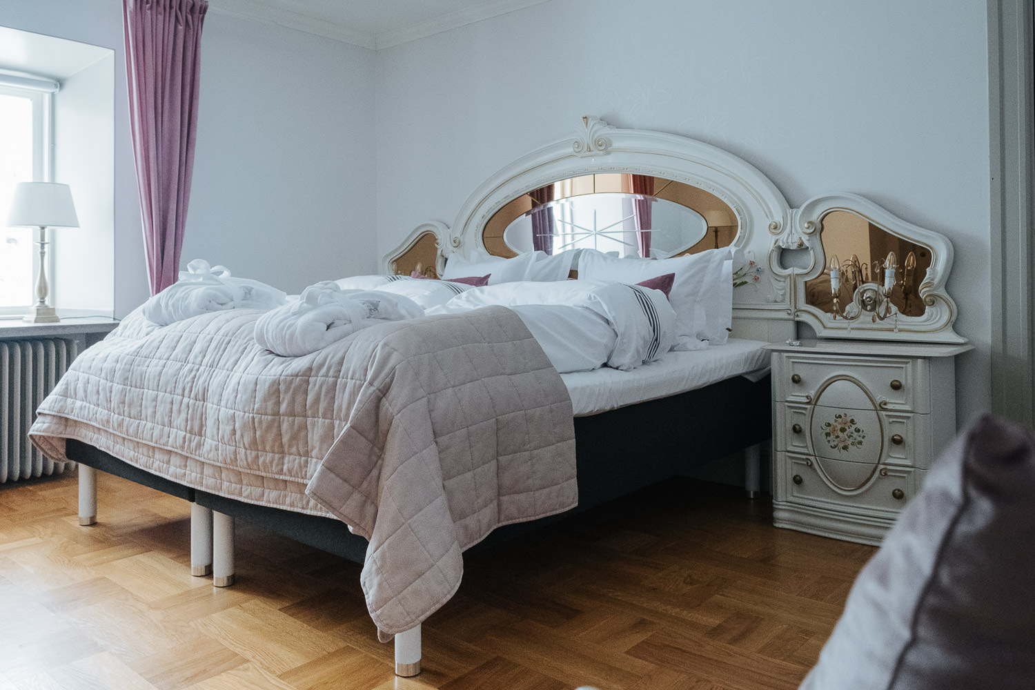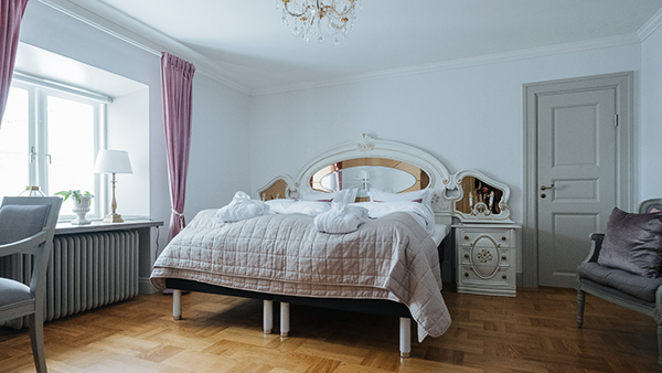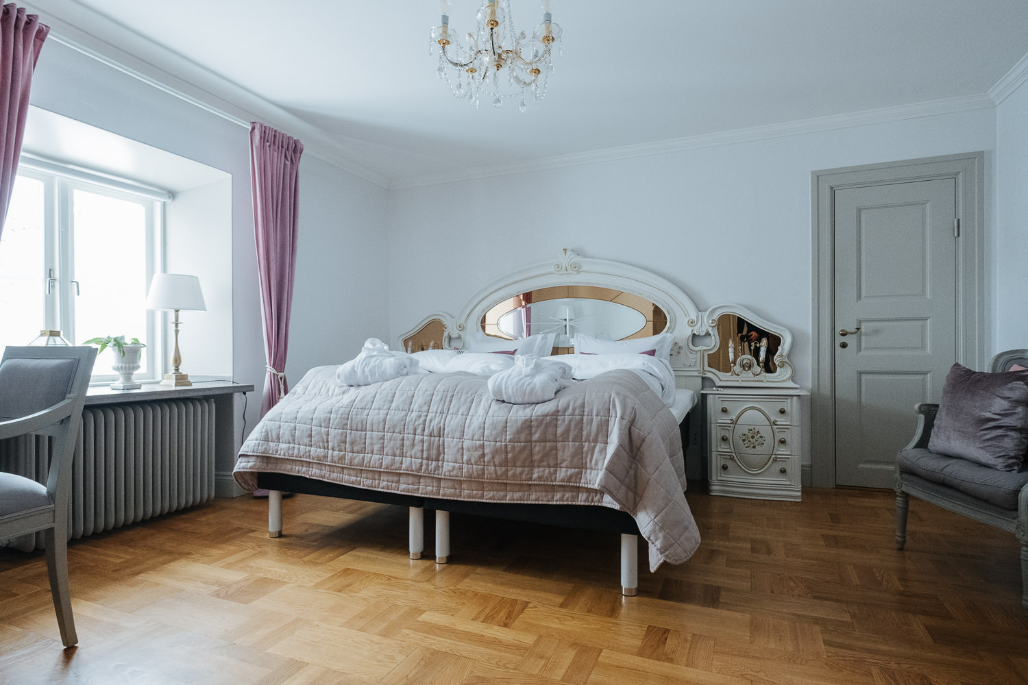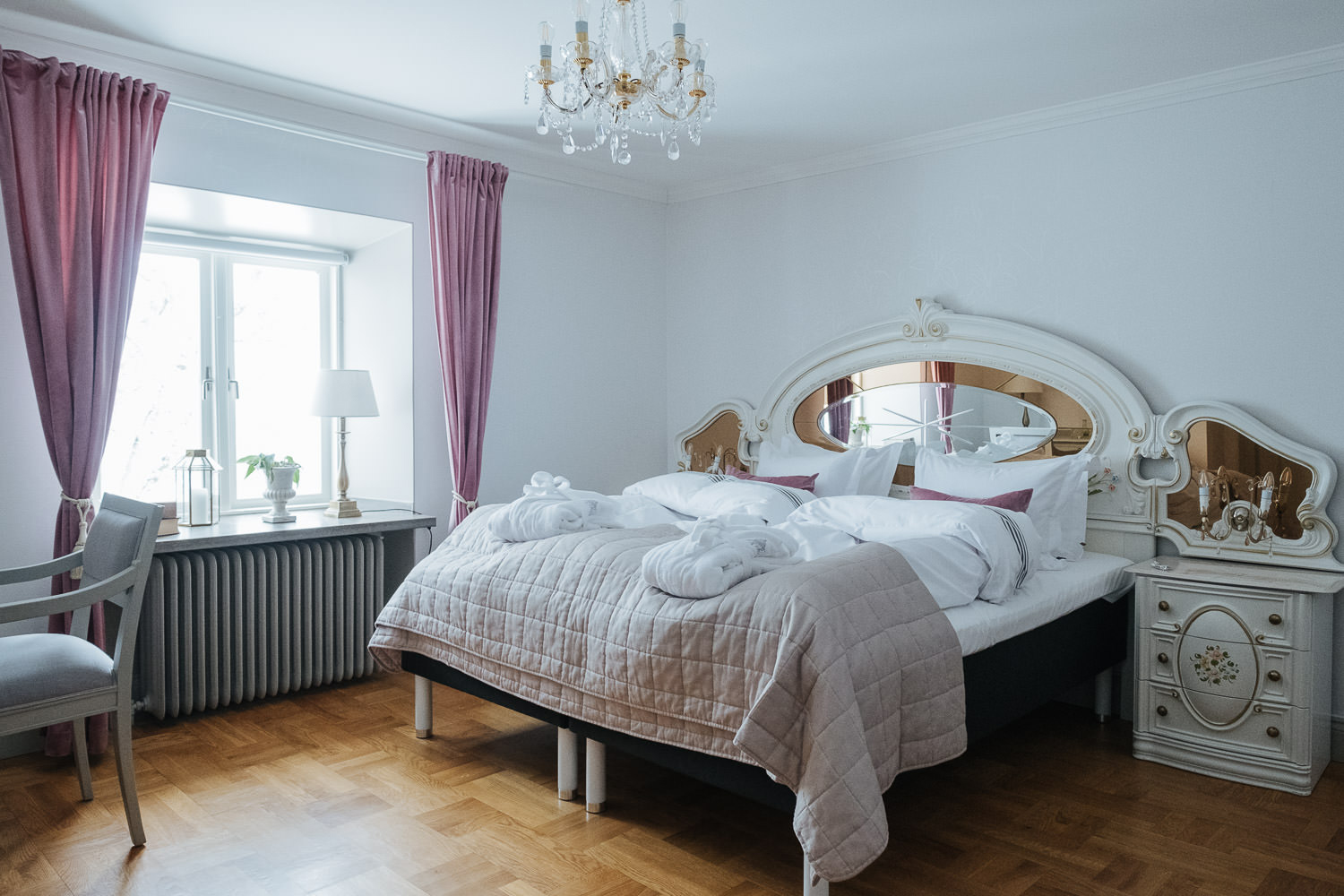 Detta är Yvonne Rydings favoritrum, men när hon inte är hos oss och hälsar på får du givetvis boka in dig här! En gudomlig sänggavel till dubbelsängen finns i detta rum samt ett lyxigt badrum med ett badkar att mysa i. Utsikt mot stall samt herrgårdspark.
